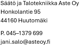 Säätö ja Talotekniikka Aste Oy on Keski-Suomen alueella toimiva, talotekniikkapalveluita tuottava yritys. Kotipaikkamme sijaitsee Äänekoskella.